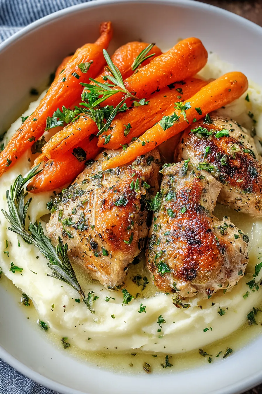 Garlic Herb Chicken with Creamy Mash & Roasted Carrots