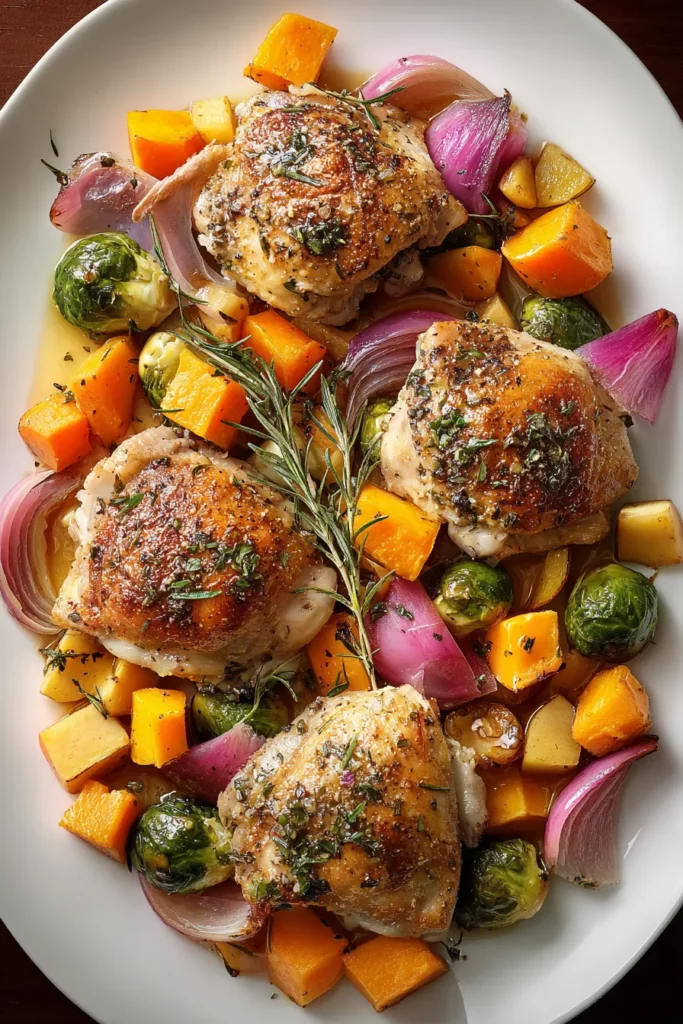 This autumn chicken dinner features succulent chicken thighs paired with roasted vegetables and a sweet honey-balsamic glaze, creating a hearty and vibrant meal perfect for cozy nights.