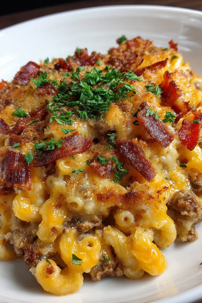 This casserole is a flavor-packed symphony of smoky, savory, and creamy elements that bring together everything we love about cheeseburgers, bacon, and mac ’n’ cheese into one hearty, soul-warming meal. With each forkful, you’ll encounter perfectly cooked elbow macaroni coated in a luscious, homemade cheese sauce that’s studded with crisp bits of bacon and juicy crumbles of seasoned ground beef. As you dive in, you’re greeted by the zing of tangy BBQ sauce weaving through layers of sharp cheddar, melted mozzarella, and nutty Parmesan. This dish is all about big flavors and comforting textures, making it the ultimate centerpiece for busy weeknight dinners, cozy gatherings, or whenever you crave a dish that feels like a warm hug for your taste buds.