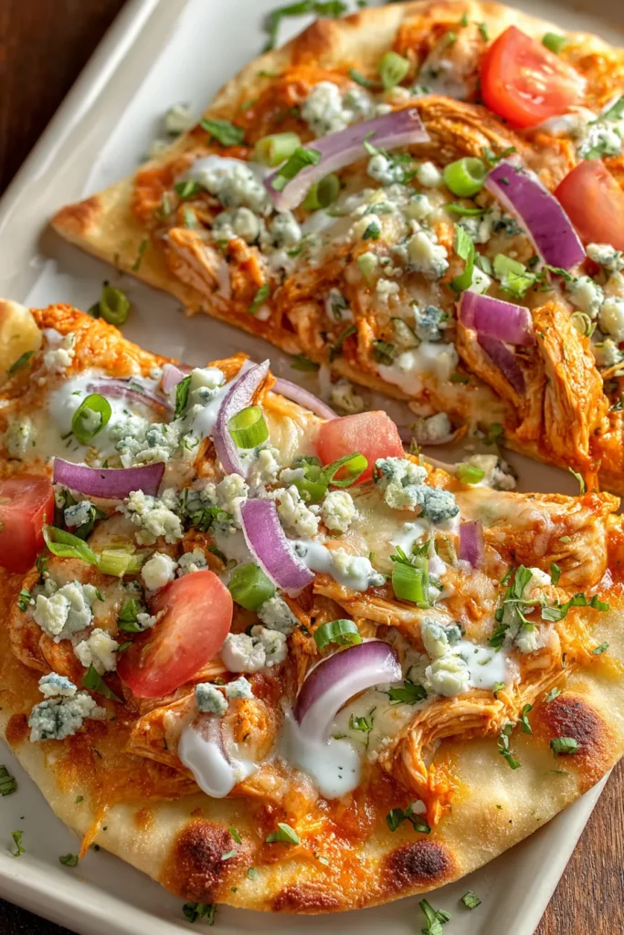 Slice the flatbread into small wedges and arrange them on a large wooden board. Add bowls of extra buffalo sauce, ranch dressing, and crispy celery sticks around the edges for a share-and-dip style that’s perfect for cheering crowds.