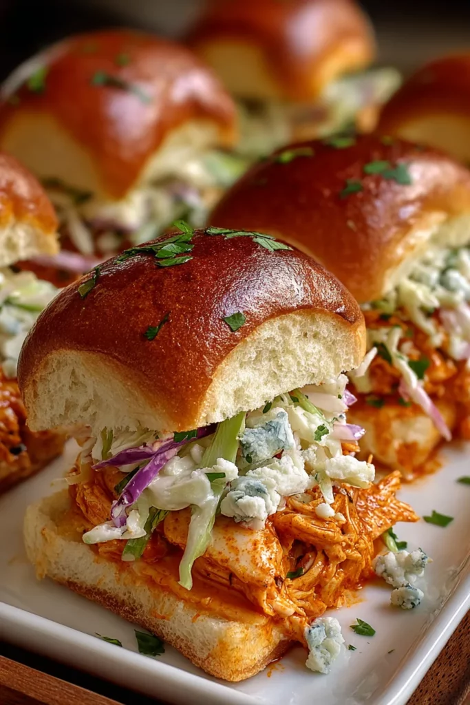 Replace the tops, serve immediately, and enjoy your Buffalo Chicken Sliders!