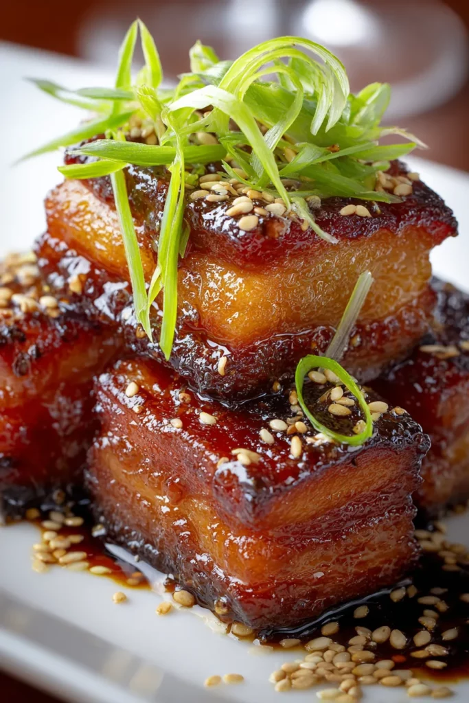 This dish features succulent pork belly with a crispy skin, glazed in a sweet and savory sauce that caramelizes to perfection while roasting. Perfect for any meat lover!