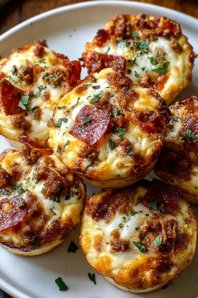 Savor the explosion of flavors in every bite of these hearty pizza muffins, packed with meats and cheese, perfect for breakfast or a snack.