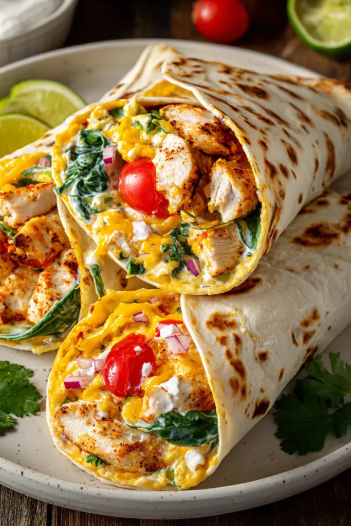 These Cheesy Chicken Garlic Wraps are bursting with savory flavors, creamy cheese, and fresh veggies, all wrapped up in a soft tortilla — perfect for any meal!