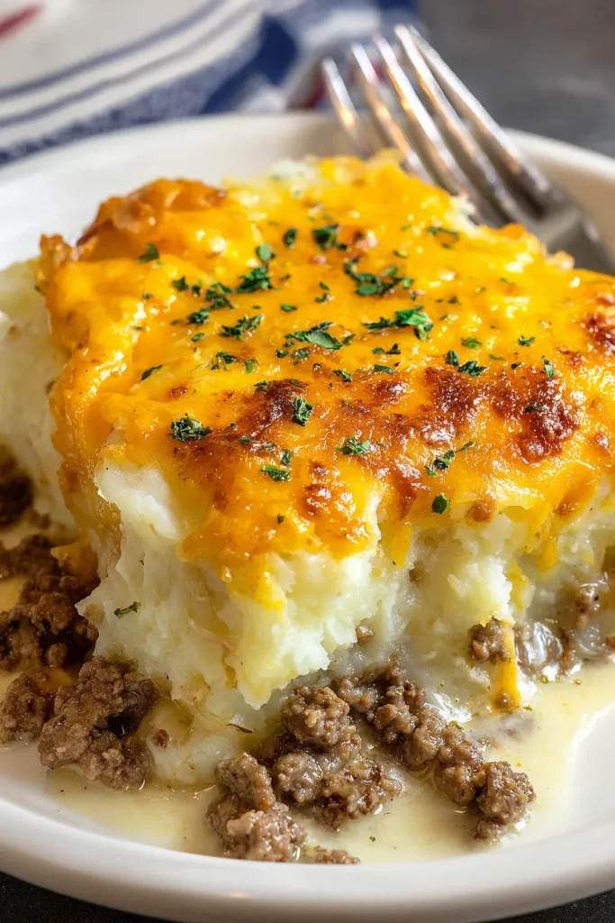 Many of my earliest kitchen adventures began with a simple casserole, so every time I pull this cheesy ground beef and potato bake from the oven, it feels nostalgic and new at the same time. When I was a busy college student juggling classes and part-time shifts, I learned that a hearty casserole could stretch ingredients, feed study groups, and even turn leftovers into next-day lunches that rivaled any takeout. Now, as someone who writes about comfort food and loves SEO-friendly recipes, I’m thrilled to share this dish with you because it hits all the marks: it’s easy, beginner-friendly, and deeply satisfying. The finely chopped onions and minced garlic infuse the skillet with savory sweetness, while the rich cream of mushroom soup binds everything together. As I slide the dish into my preheated oven at a cozy 350°F (175°C), the house slowly transforms, filled with hints of melted butter and roasting potatoes. By the time I lift the foil to reveal that bubbly, golden cheese crust, I know I’ve struck gold. This casserole is more than just a meal; it’s a memory maker and a family favorite that I hope will bring smiles to your table.