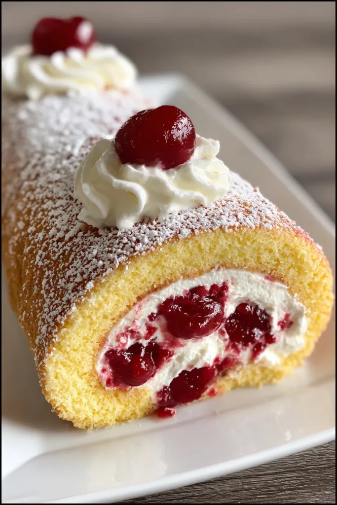 This Cherry Cheesecake Cake Roll features a light, fluffy cake filled with smooth cream cheese and topped with sweet cherry pie filling. It's a delightful treat perfect for any occasion!