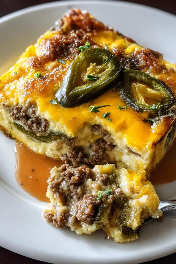 This Chile Relleno Casserole packs layers of savory ground beef, gooey cheese, and green chilies baked to perfection, making it a mouthwatering family favorite.