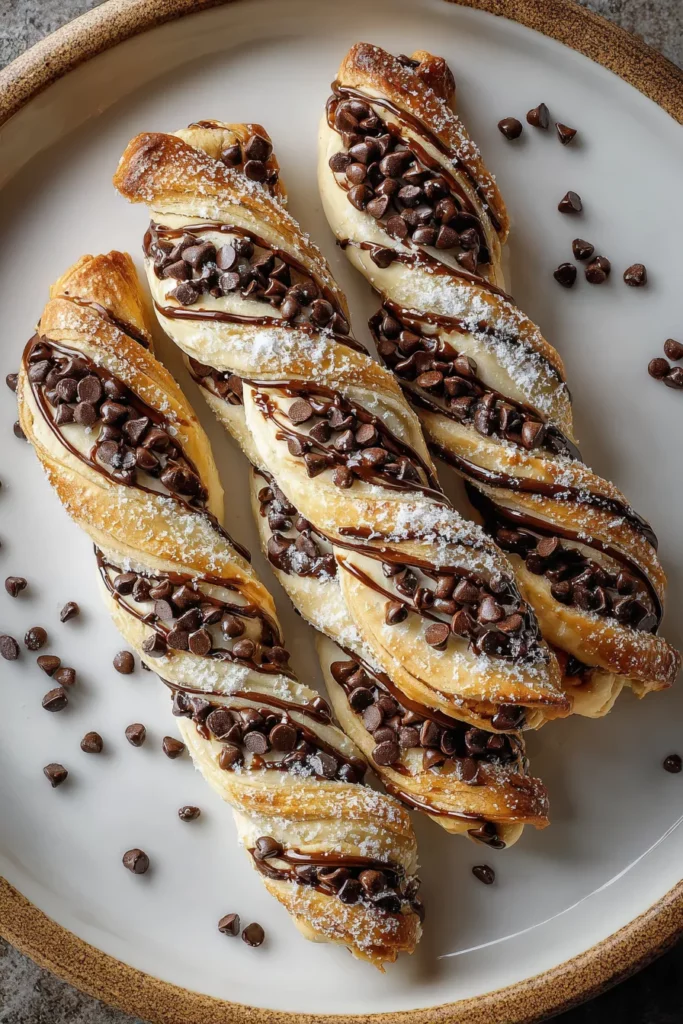 These Chocolate Chip Cookie Dough Twists combine the rich, sweet flavor of cookie dough with a flaky, buttery puff pastry—perfectly baked to satisfy your cravings.