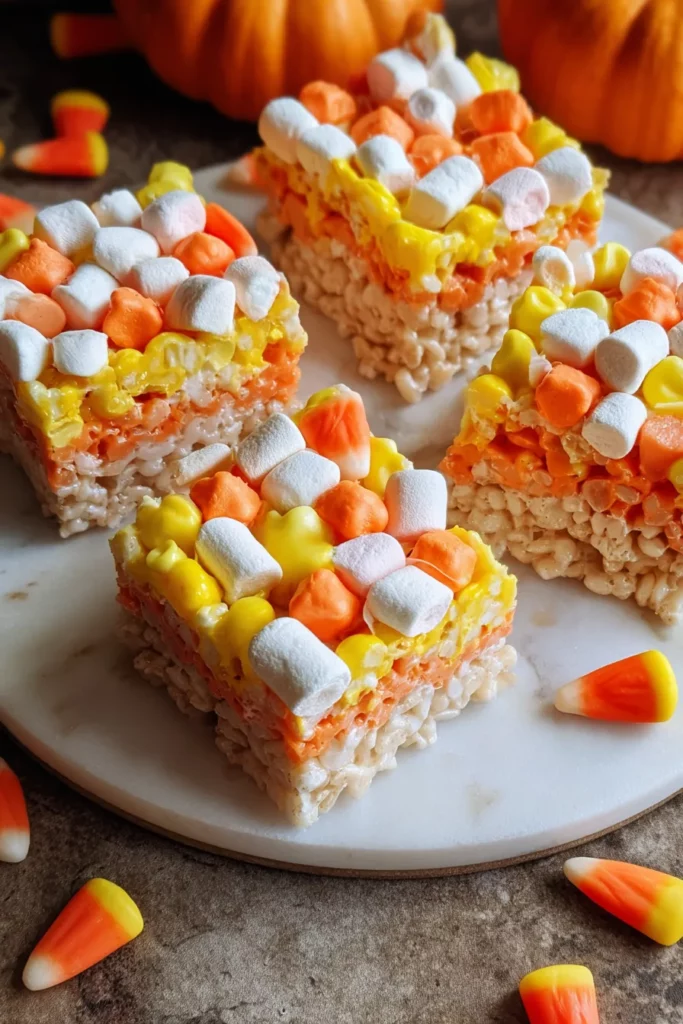 I’m eager to hear about your adventures with these marshmallow-y, candy corn–studded bars. Did you stick to the classic orange and yellow drizzle, or did you experiment with other colors and flavors? Maybe you added chopped nuts or pretzels for extra crunch—let me know how your personal tweaks turned out! If you have any questions about substitutions, melting techniques, or storage specifics, drop them in the comments. Your feedback not only helps me fine-tune this recipe but also guides fellow home cooks through their own candy corn creations. Whether you’re a beginner baker looking for a stress-free Halloween treats recipe or a seasoned enthusiast seeking a colorful twist on classic rice cereal desserts, this article was crafted with you in mind. Happy baking, and here’s to making sweet memories and even sweeter dessert bars—can’t wait to see what you come up with!