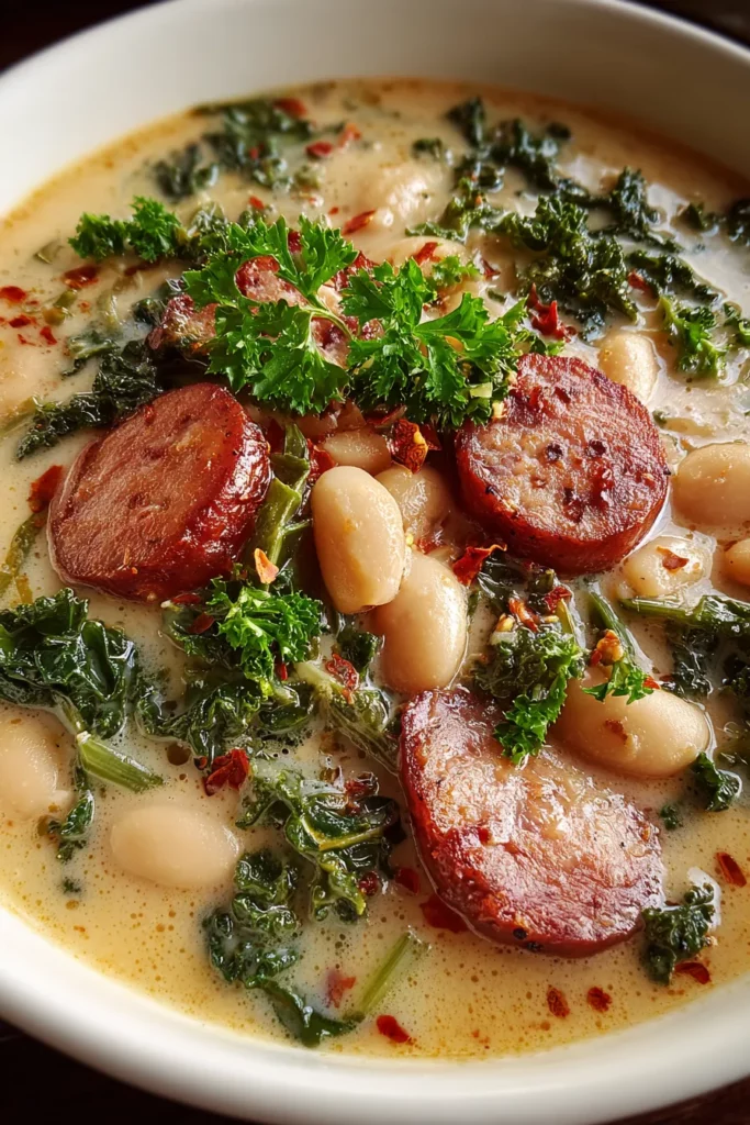 As a passionate home cook who thrives on bold flavors and easy techniques, I adore how this recipe balances textures and tastes. The slight crisp of browned sausage gives way to the creamy richness of beans, while the kale adds just enough green pop to keep things fresh. Every step—from sautéeing onions until translucent to seasoning with a pinch of red pepper flakes—feels like a mini celebration of aroma and color. And best of all, this is a beginner-friendly dish: in about 15 minutes of prep and 30 minutes of cooking time, you’re rewarded with a bowl that tastes like you’ve labored over it all day. So grab your favorite wooden spoon, heat up that pot, and get ready to dive into a soup that feels like home, no matter where you are.