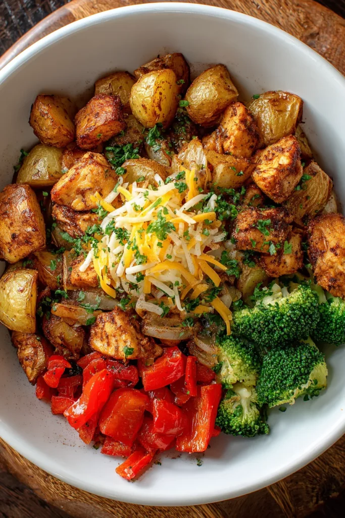 This beginner-friendly dish takes just 15 minutes of prep and about 35 minutes of cooking time, clocking in under an hour from start to finish—and it’s all done in one skillet and a baking sheet. With only a handful of everyday ingredients, you’ll whip up a hearty, 450-calorie bowl that’s perfect for lunch, dinner, or meal prep. Feel free to swap in sweet potatoes for a twist, toss in your favorite veggies, or drizzle on hot sauce or a tangy dressing for extra zing. Trust me, once you taste those crispy potato edges and succulent chicken bites nestled in a bed of melty cheese and vibrant veggies, you’ll wonder how you ever lived without this comforting, wholesome bowl!
