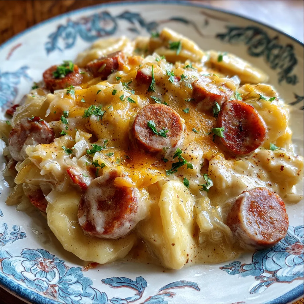 Creamy layers of potato-stuffed pierogi and sour cream blend with sharp cheddar, sauerkraut, and smoky kielbasa in a low-and-slow casserole. Each scoop offers tender dumplings, melty cheese, and a hint of tang.
