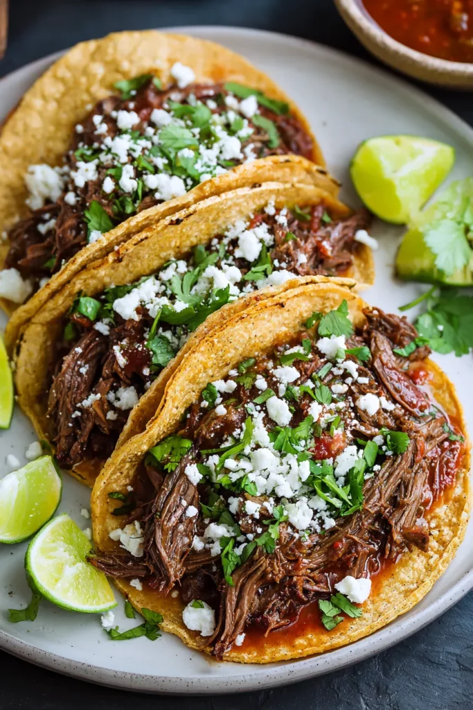 9. Assemble each street taco by adding a generous helping of shredded beef to a warm tortilla. Top with chopped cilantro, crumbled Cotija cheese, and serve with lime wedges and your favorite salsa or hot sauce.