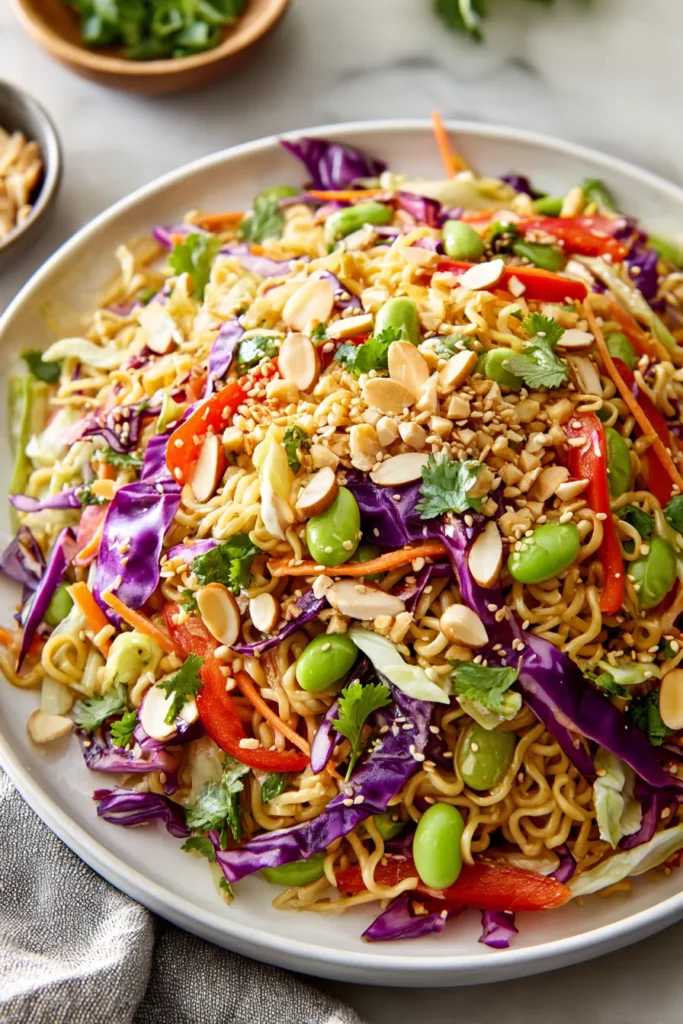 7. Serve immediately on a platter or family-style bowl. This Crunchy Asian Ramen Noodle Salad shines as a refreshing side dish or stands alone as a light, flavorful meal.