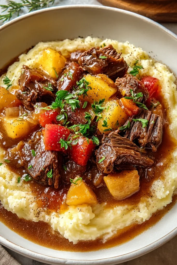 This comforting stew blends savory beef, sweet apples, and fragrant spices, creating a delicious dish that’s perfect for cool autumn nights when served atop fluffy mashed potatoes.
