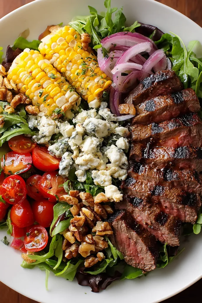 This salad combines tender grilled steak with creamy gorgonzola, sweet corn, and fresh greens, topped with a tangy balsamic vinaigrette for an explosion of flavors in every bite.