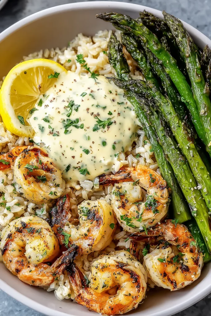 Imagine succulent grilled shrimp paired with tender asparagus, all over a bed of wholesome brown rice, drizzled in a zesty creamy garlic sauce. A perfect bowl of fresh, vibrant flavors.
