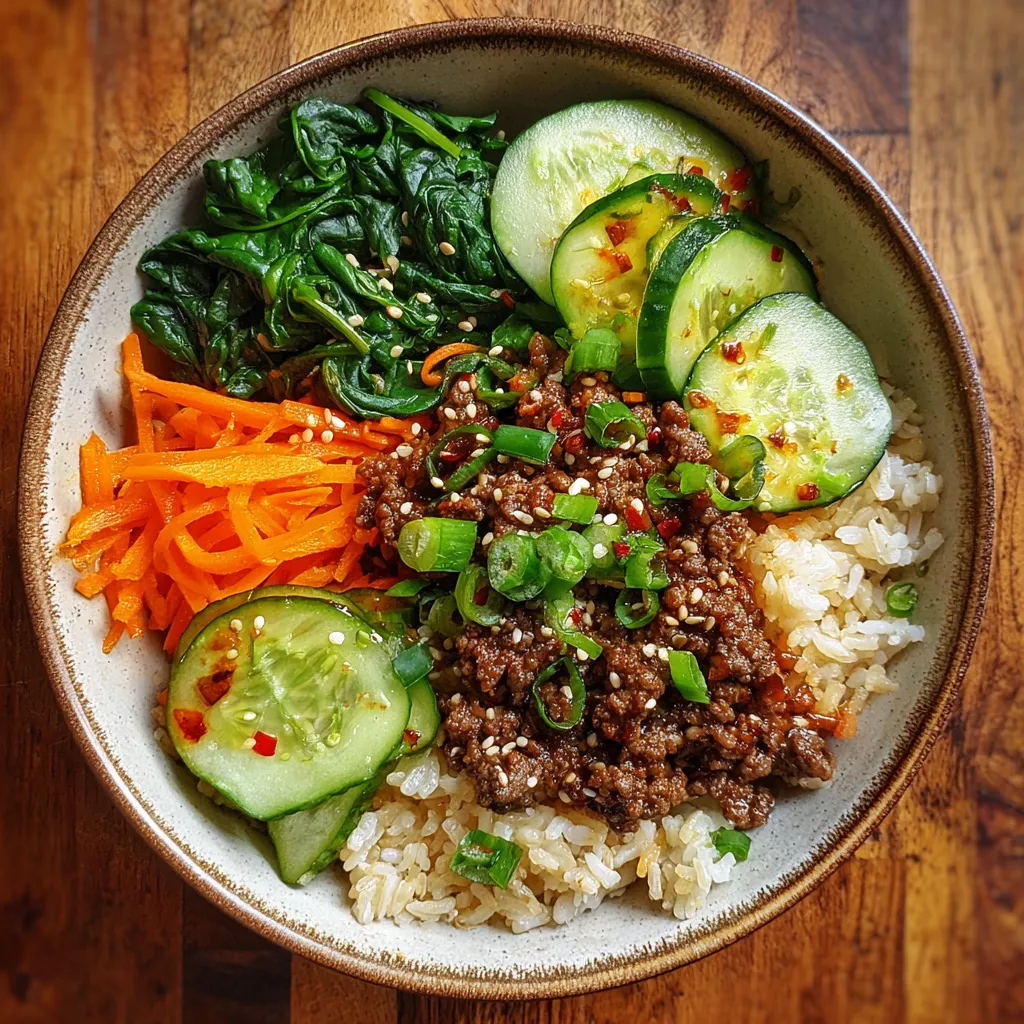 Experience savory ground beef simmered in soy and honey, fragrant with garlic and ginger, layered over warm brown rice and fresh spinach, carrots, and cucumber for a balanced, vibrant meal.