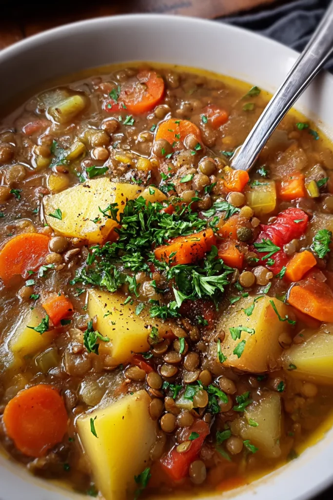 Packed with earthy lentils, tender potatoes, and a medley of vegetables, this soup offers a delightful balance of flavors, warmth, and comfort in every spoonful.