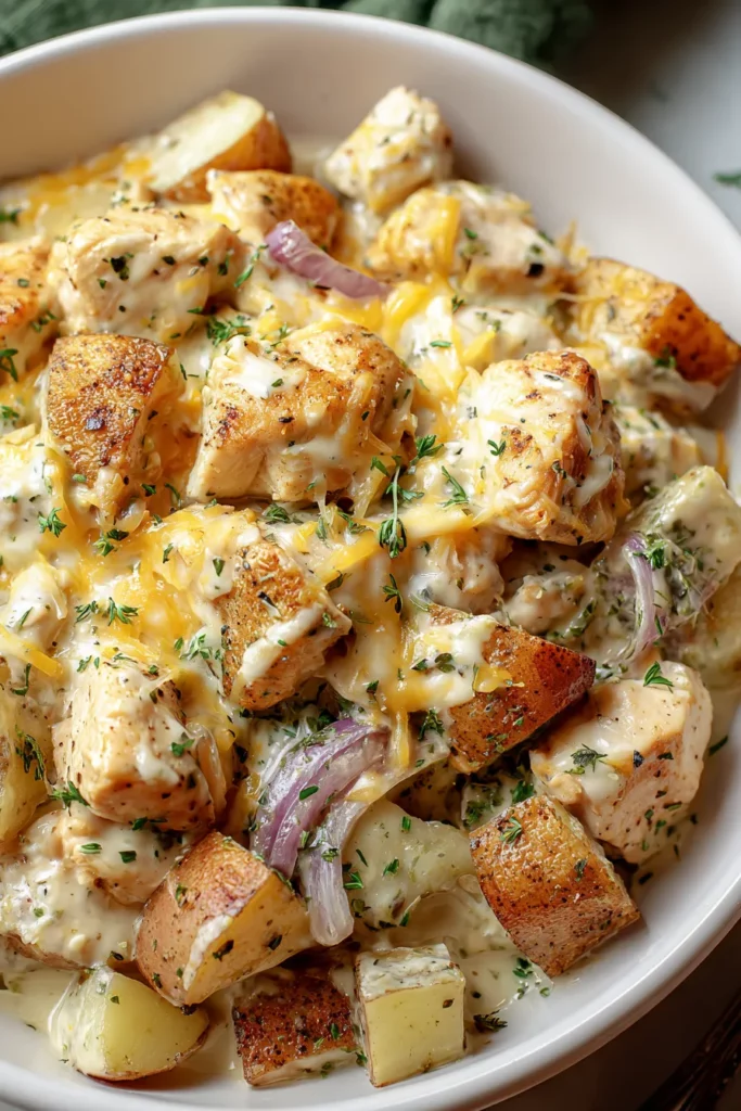This High-Protein Creamy Garlic Cheesy Chicken & Potatoes recipe has it all: an irresistible, velvety sauce, perfectly tender chicken, and potatoes that soak up every bit of cheesy garlic goodness. Whether you’re cooking for a family dinner, hosting friends, or just craving something soul-warming after a long day, this dish delivers on flavor, comfort, and convenience. From the quick 20-minute prep to the 30-minute bake time, it’s an ideal quick dinner for anyone who loves hearty comfort food without a mountain of dishes. Plus, as a beginner-friendly recipe, it builds confidence in the kitchen while teaching fundamental techniques like sautéing garlic, simmering a cream sauce, and baking to perfection.