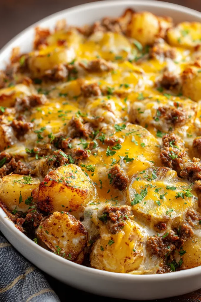 I still remember the first time I made this recipe on a crisp autumn evening when my oven’s warmth made the whole kitchen feel like a hug. With only 20 minutes of active prep and about 1 hour and 15 minutes of cooking, plus a 10-minute rest, you’ll have this soul-soothing bake on the table before you know it. At around 450 calories per serving, it’s a satisfying dinner that feels decadent without breaking the bank. As a beginner-level dish, it’s forgiving: you can swap ground turkey for beef or experiment with different cheeses like Gruyère or Monterey Jack. Leftovers store beautifully for up to three days, making it a go-to for busy weeknights or casual gatherings. So grab your buttered baking dish and let’s dive into the delicious simplicity of this rustic potato and beef bake!