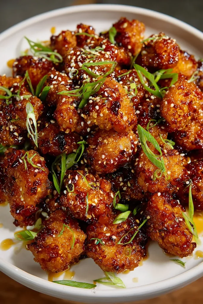 5. Transfer the glazed chicken bites to a serving dish. Sprinkle with sesame seeds and sliced green onions for an extra layer of flavor and a delightful crunch.