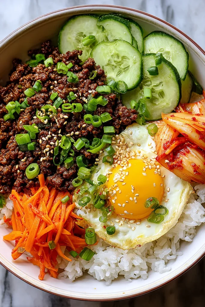 Korean Ground Beef Bowl is one of those recipes that feels like a warm hug on a busy weeknight. Every bite is a harmonious blend of savory, sweet, and just the right amount of heat, making it the ultimate comfort food with a vibrant kick. From the moment you start sautéing garlic in fragrant sesame oil to the final sprinkle of sesame seeds, this dish captivates your senses. It’s quick enough to whip up after work yet impressive enough to serve to friends at a casual dinner. The fusion of flavors—rich beef, tangy kimchi (if you choose!), crisp cucumbers, and sweet carrots—creates a bowl that’s both satisfying and exciting. Whether you’re cooking for one or feeding a crowd, this Korean Ground Beef Bowl adapts beautifully to your needs.