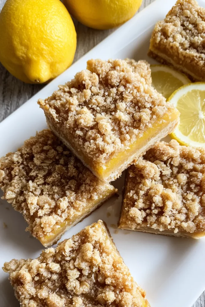 Lemon Oatmeal Crumble Bars combine tangy lemon filling with a crunchy oat topping, creating a delicious balance of sweetness and tartness in every bite.