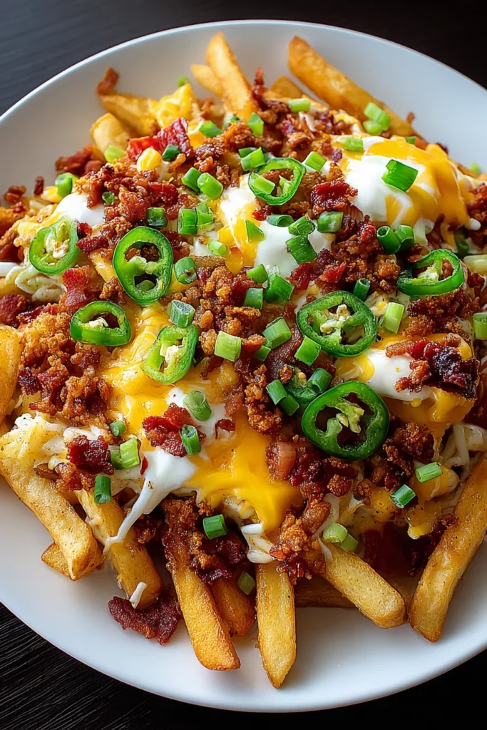 When crispy, golden edges meet a blanket of molten cheese and fiery jalapeño slices, you know you’re in fry heaven. Loaded Spicy Cheesy Dirty Fries take the humble potato and catapult it into a world of flavor–from the moment you slide that first hot, crunchy fry into your mouth, you’re met with layers of smoky paprika, a whisper of garlic, and just the right amount of cayenne to ignite your taste buds. These fries aren’t just a side dish; they’re the star of the show, boasting a gooey marriage of cheddar and mozzarella cheese that stretches with every bite. And let’s not forget the crumbled bacon that adds that satisfying, savory crunch. Whether you’re gathering for game day, planning a party snack platter, or simply craving a bold snack at home, this easy recipe (just a 10-minute prep and 30-minute cook time) is perfect for beginner cooks and seasoned chefs alike. With only 750 calories per serving, you can feel good about indulging in this comfort food masterpiece.