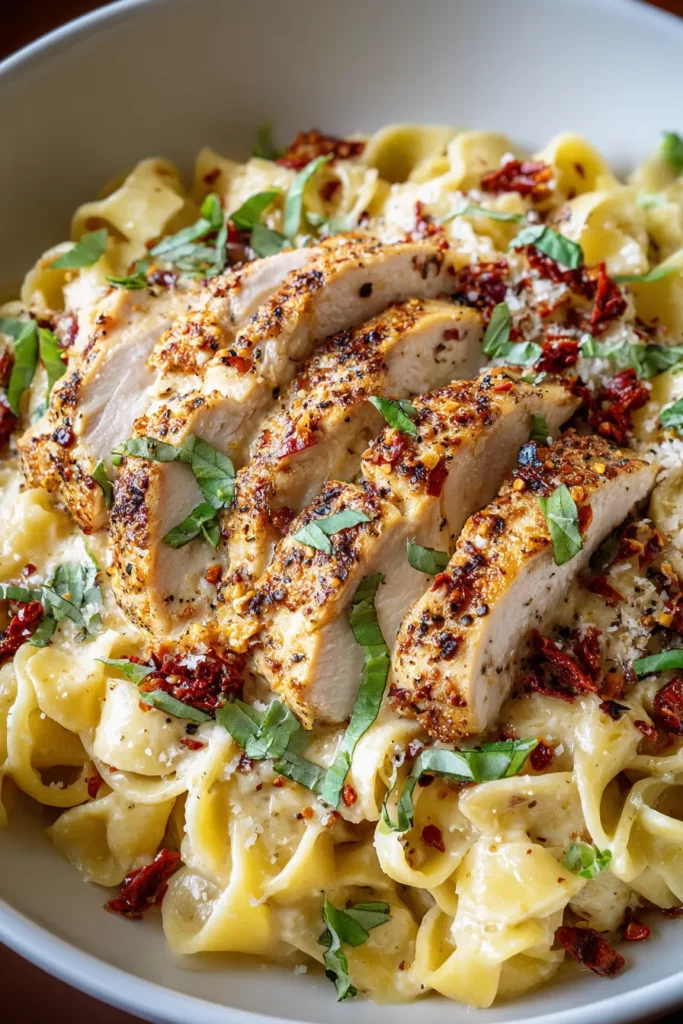This creamy and flavorful pasta showcases tender chicken, sun-dried tomatoes, and a rich Parmesan sauce. Perfect for a romantic dinner or a cozy night in, every bite is pure love!