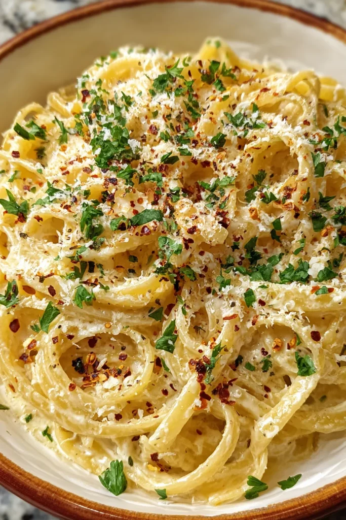 As you dive into this hassle-free delight, you’ll appreciate how each step unfolds effortlessly. A quick 10-minute prep, followed by 15 minutes on the stove, and a short 5-minute rest transforms simple ingredients into a restaurant-quality meal that clocks in at around 600 calories per serving. Whether you’re looking for a cozy weeknight dinner, a comforting lunch, or a dish to wow friends on a casual gathering, this creamy, garlicky creation checks every box. Gathering around the table, you’ll notice how the sauce clings to each strand of pasta, delivering that irresistible combination of savory, creamy, and subtly spicy flavors—especially if you dare to add a sprinkle of crushed red pepper flakes. It’s the kind of recipe you’ll return to time and again, perfect for busy nights and relaxed weekends alike.