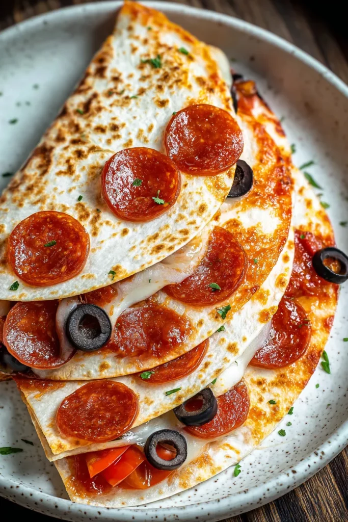 These scrumptious quesadillas feature gooey mozzarella, savory pepperoni, and zesty pizza sauce, all tucked inside crispy tortillas. Perfect for any meal or snack!