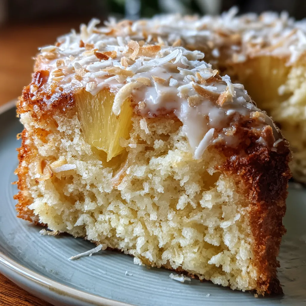 Each bite reveals juicy pineapple pieces and shredded coconut in a tender sponge, finished with airy whipped cream frosting and a sprinkle of coconut for a light, tropical finish.