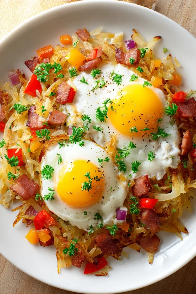 This breakfast hash is a perfect blend of crispy shredded potatoes, sautéed veggies, and protein-rich eggs, all topped with melted cheddar. A nutritious twist on a classic!