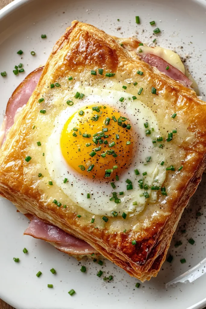 This dish features layers of flaky puff pastry, rich béchamel, savory ham, and a perfectly fried egg, combining textures and flavors for a delightful meal.