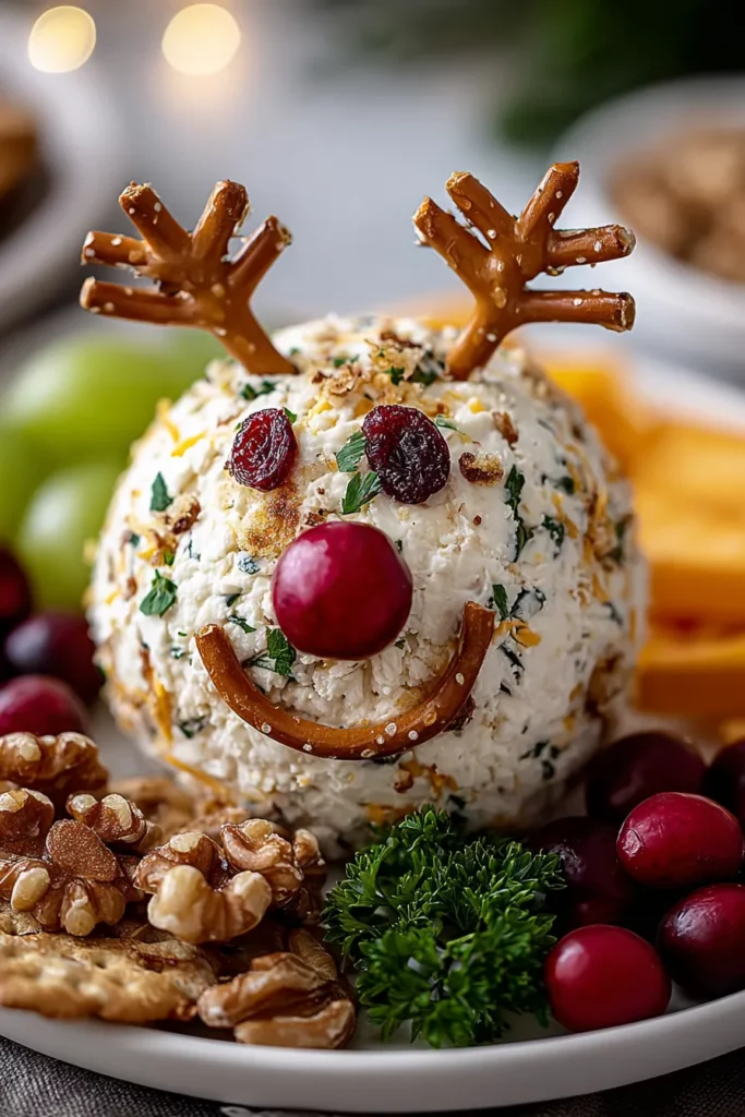 Arrange your reindeer cheese ball on a wooden board surrounded by an assortment of gourmet crackers, sliced baguette, and artisan breadsticks. Garnish with sprigs of fresh rosemary or thyme for an evergreen accent and let guests graze at their leisure.