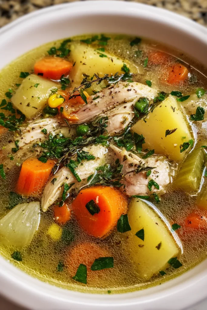 This Savory Hearty Herb-Infused Chicken Soup is a comforting mix of tender chicken, fresh vegetables, and aromatic herbs in a rich broth that's perfect for any occasion.