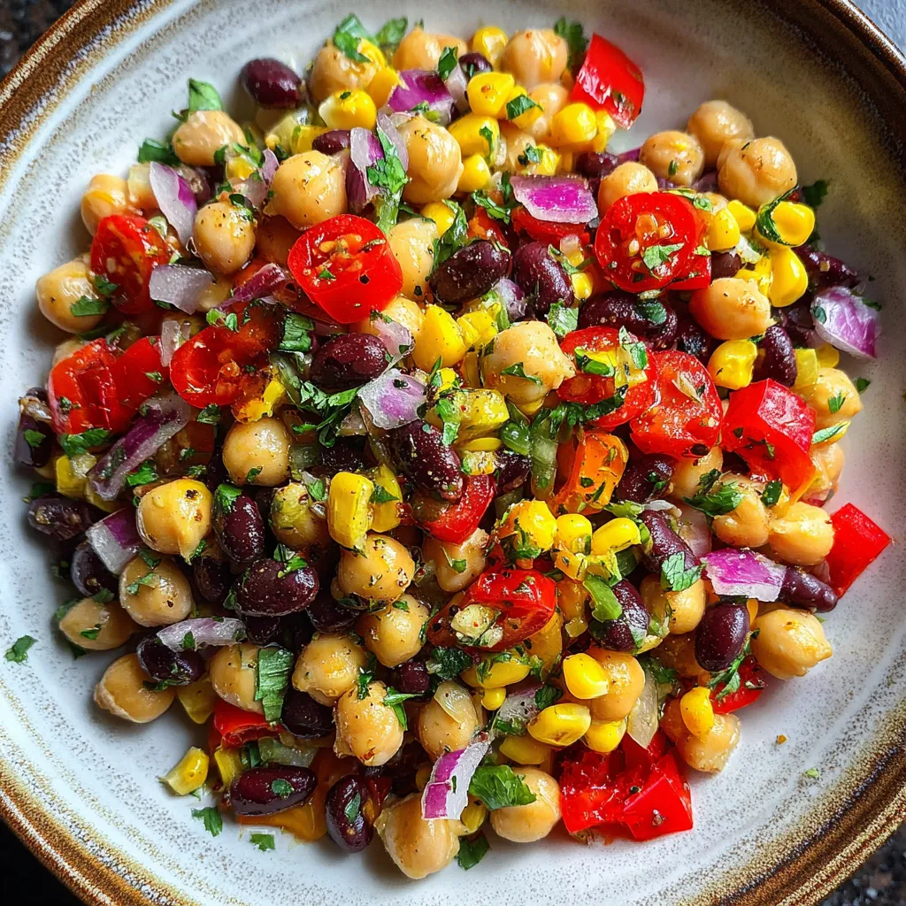 Bright chickpeas and black beans mingle with sweet corn, crunchy peppers, and fresh cilantro, all coated in a tangy lime-cumin dressing for a satisfying, flavor-packed salad.