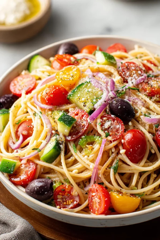 Spaghetti Salad with Zesty Italian Dressing brings a fiesta of color and flavor to any table. This vibrant dish combines al dente spaghetti noodles drenched in a tangy, zesty Italian dressing with fresh, crisp vegetables that pop with every bite. It’s the kind of recipe that makes you linger around the counter, chatting with friends or family as you marvel at how the red cherry tomatoes glisten and the green bell pepper adds that perfect crunch. When you fork into a mouthful, the juicy tomatoes and cucumbers burst, balanced by the briny bite of black olives and the subtle sharpness of thinly sliced red onion. Each strand of pasta carries that bold dressing, bringing all these ingredients together in harmony.