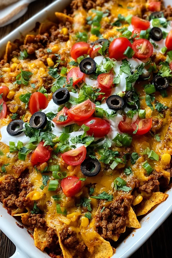 This Spicy Cheesy Baked Taco Casserole has everything you need for a crowd-pleasing, fuss-free dinner: seasoned ground beef, hearty beans, sweet corn, crunchy tortilla chips, and a perfect blend of cheddar and Monterey Jack cheeses. With beginner-friendly steps, a total cook-and-rest time under an hour, and around 450 calories per serving, it’s an unbeatable option for busy weeknights, casual gatherings, or anytime you crave a satisfying baked tacos twist. From assembling layers to the final bubbly bake, this recipe captures all the flavors of your favorite taco night in one pan. Don’t forget to garnish with fresh cilantro and a dollop of sour cream—or turn up the heat with jalapeño slices if you’re in the mood for spicy recipes.