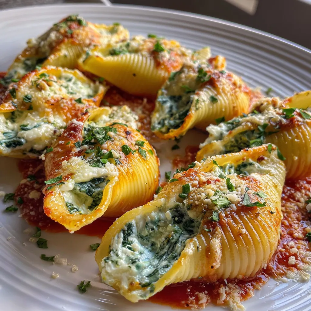 Creamy ricotta and spinach mix fills tender pasta shells, nestled in rich tomato sauce and topped with melted mozzarella for a bubbling, golden bake that brings cozy Italian flavors to your table.