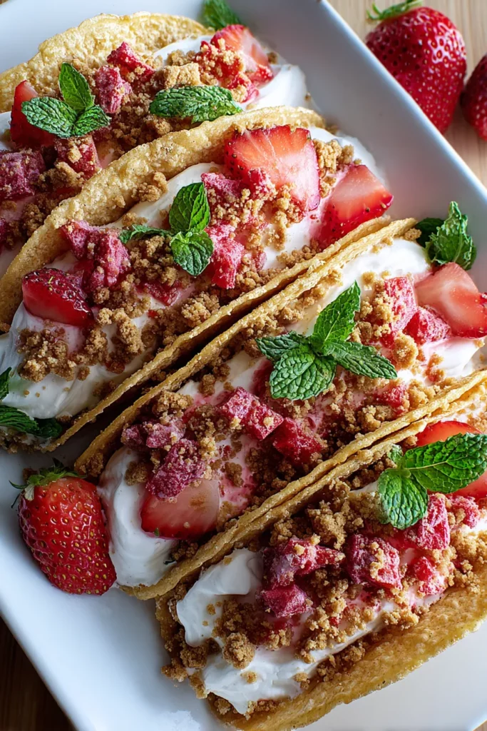 Top each taco with small edible blooms—like violets or pansies—and a sprig of mint. This delicate touch adds visual drama and a hint of floral aroma that perfectly frames the strawberry-cheesecake combo.