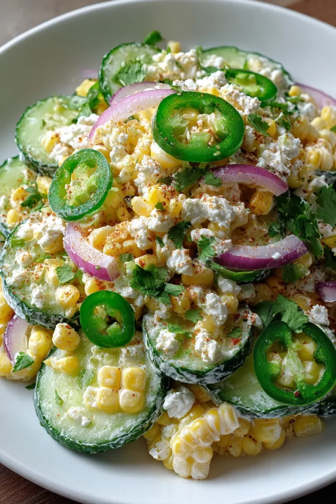This salad isn’t just a side dish; it’s a conversation starter. I remember the first time I brought it to a backyard barbecue—everyone kept reaching into the bowl, mouths watering at that perfect combination of creaminess, crunch, and spice. One of my friends even joked that she could taste the ocean breeze in those tender kernels of corn. Since then, this recipe has become my go-to for potlucks, lazy weekend lunches, and impromptu family dinners. You’ll find it perfectly at home next to grilled chicken, piled into tacos, or served simply in a big bowl with extra lime wedges on the side. And because it’s so easy to make in advance, you can focus on enjoying your guests rather than juggling pots and pans. So grab your cucumbers, corn, and all those vibrant ingredients—you’re about to brighten up your table like never before.