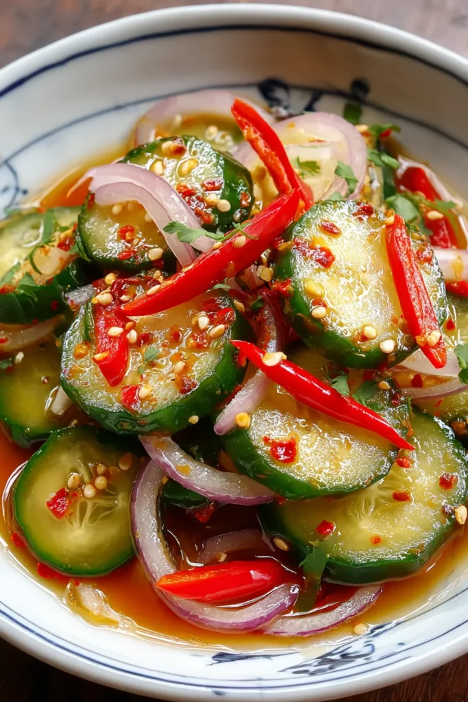 Thinly sliced onions bring a subtle sweetness and mild sharpness that complements the cucumbers and balances the heat.