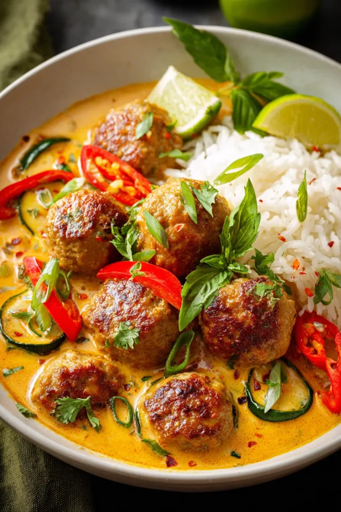 I hope this journey through Thai Chicken Meatballs in Coconut Curry has inspired you to bring a taste of Thailand into your kitchen. We explored everything from the vibrant key ingredients—like fragrant cilantro, zingy lime juice, and creamy coconut milk—to the step-by-step process for crafting perfectly juicy meatballs and a luscious curry sauce. We also covered serving suggestions that highlight the dish’s visual appeal and flavor contrasts, and shared smart storage methods so you can savor every last bite, even days later. This recipe is a total crowd-pleaser, whether you’re planning a cozy dinner for two or a festive lunch spread. Don’t forget, it’s beginner-friendly with just 20 minutes of hands-on prep, 30 minutes of cooking, and a brief 5-minute rest before digging in—totaling around 400 calories per serving and delivering lunch or dinner perfection.