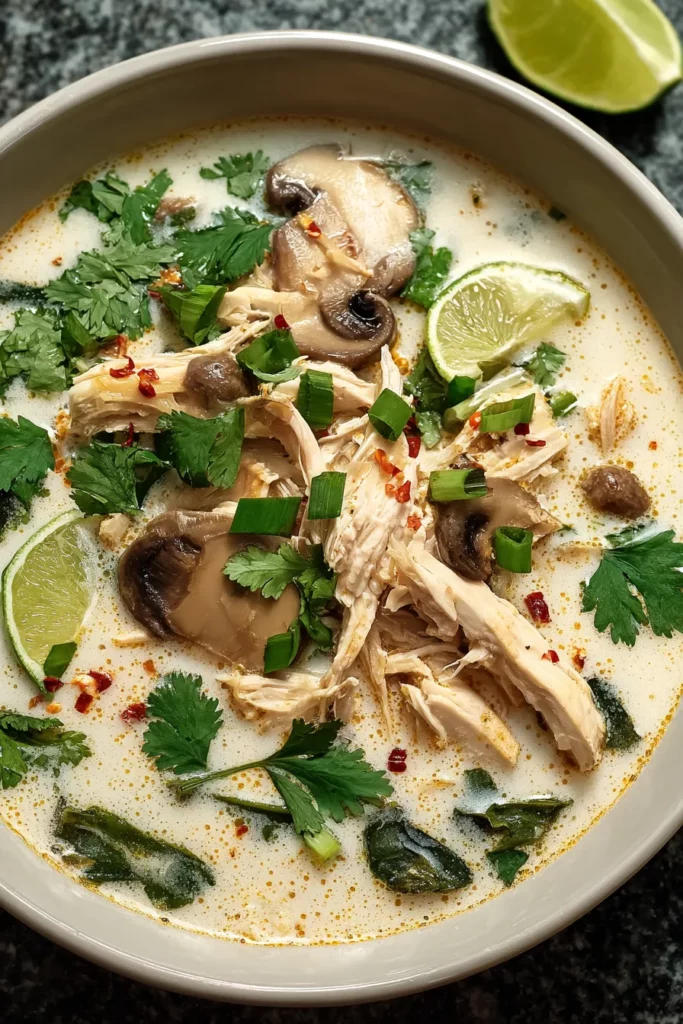 This Thai Coconut Chicken Soup blends tender chicken, creamy coconut milk, and zesty lime for a deliciously satisfying dish. Perfectly spiced, each spoonful offers authentic Thai flavors!