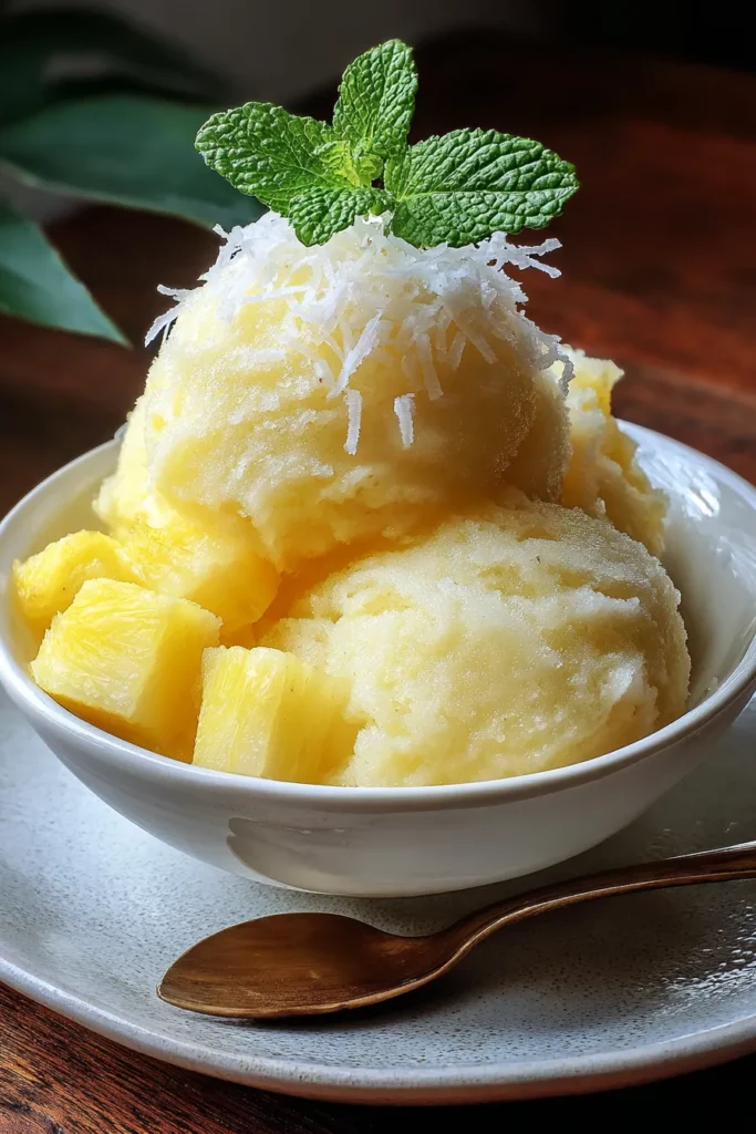 Scoop the sorbet into bowls or cones, then garnish with fresh mint leaves or a pineapple wedge. Serve immediately for the best texture and flavor.