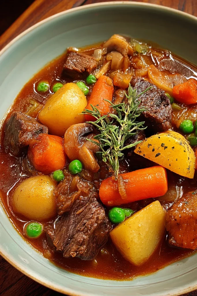 Pour a glass of the same red wine used in cooking—its light tannins and berry notes will echo the stew’s depth and make each sip feel perfectly aligned with every spoonful.