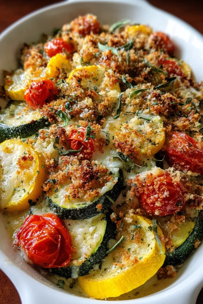 This Zucchini and Squash Casserole truly embodies the best of summer’s bounty: vibrant squash, juicy tomatoes, aromatic herbs, and a mouthwatering cheese-and-breadcrumb topping. We’ve walked through simple prep and baking steps that make it accessible for beginner cooks, yet impressive enough to share with family and friends during casual lunches or laid-back dinners. The combination of textures—tender squash, melty mozzarella, and crispy panko—creates an irresistible harmony in every slice. With only about 300 calories per serving and easy customization options, it checks all the boxes for a light yet fulfilling vegetarian dish.